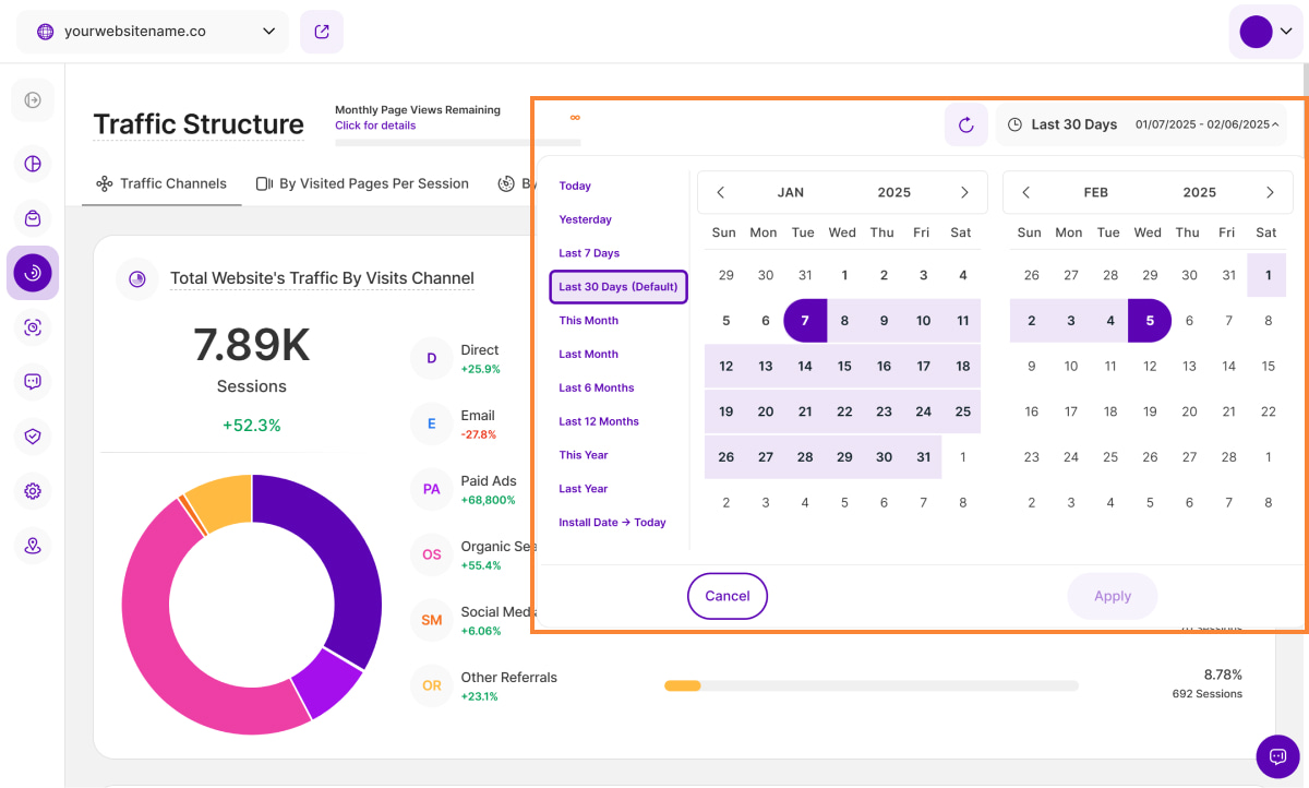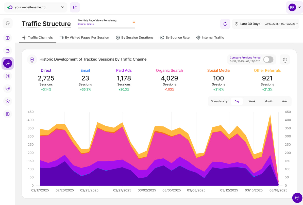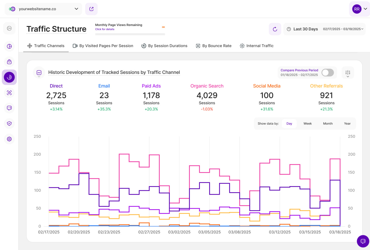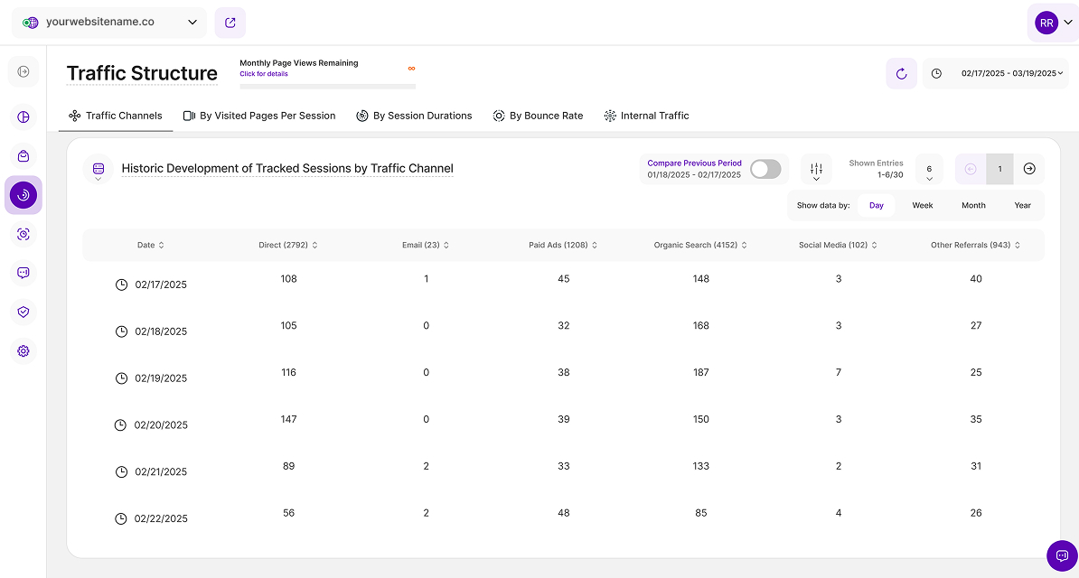 În cadrul submodulului Structura traficului, veți găsi detalii complete despre modul în care este organizat traficul de intrare pe site-ul dvs. web.