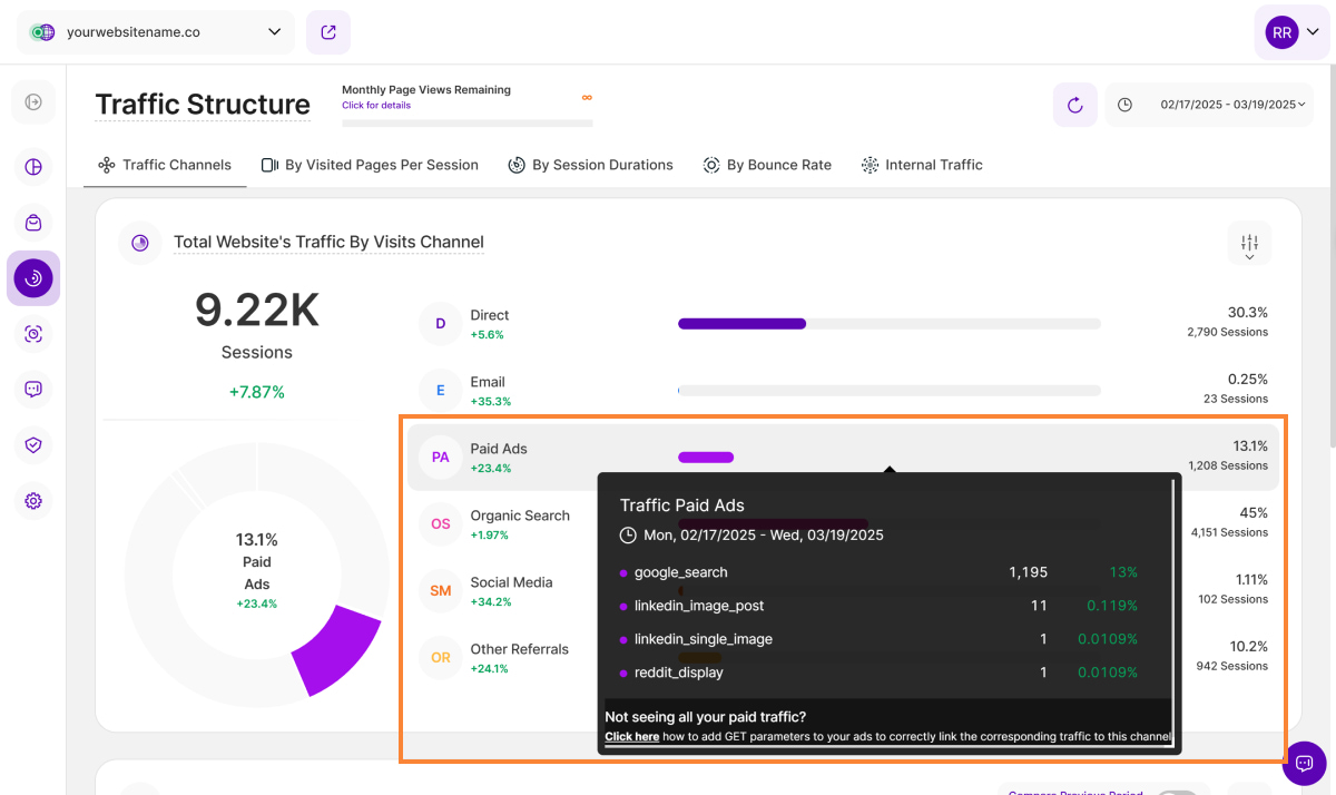 Dacă nu vedeți tot traficul dvs. plătit, faceți clic pe secțiunea Anunțuri plătite pentru a deschide tooltip-ul. Apoi, faceți clic pe link-ul Faceți clic aici din tooltip pentru a afla cum adăugarea parametrilor GET la anunțurile dvs. plătite vă poate ajuta să le clasificați mai eficient și să asigurați date de trafic mai exacte.