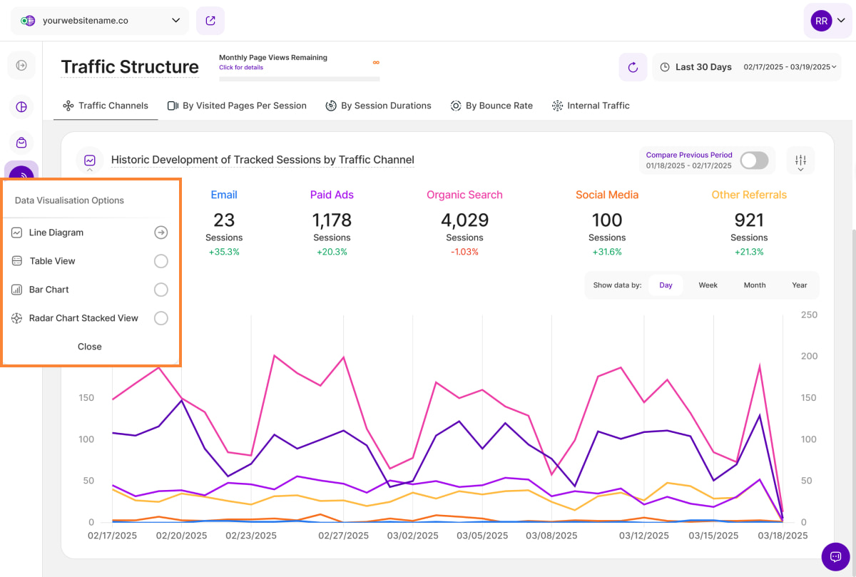 Fie că preferați diagrame cu bare, grafice cu linii sau alte formate, acum puteți vizualiza datele de trafic într-un mod care vă convine. Astfel, este mai ușor să înțelegeți tendințele și tiparele, ceea ce duce în cele din urmă la decizii mai bune.
