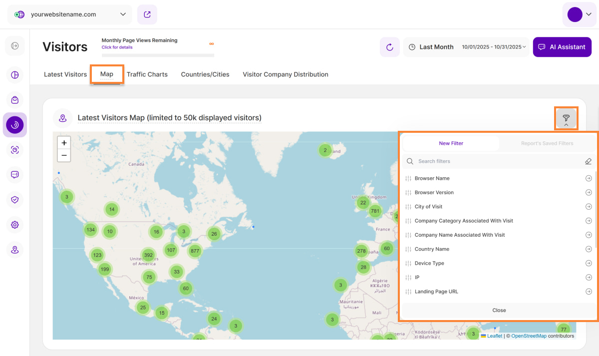 Harta ultimilor vizitatori oferă acum mai multe opțiuni de filtrare pe care le puteți utiliza individual sau în combinație pentru a rafina datele și a vă concentra analiza pe anumite regiuni geografice.