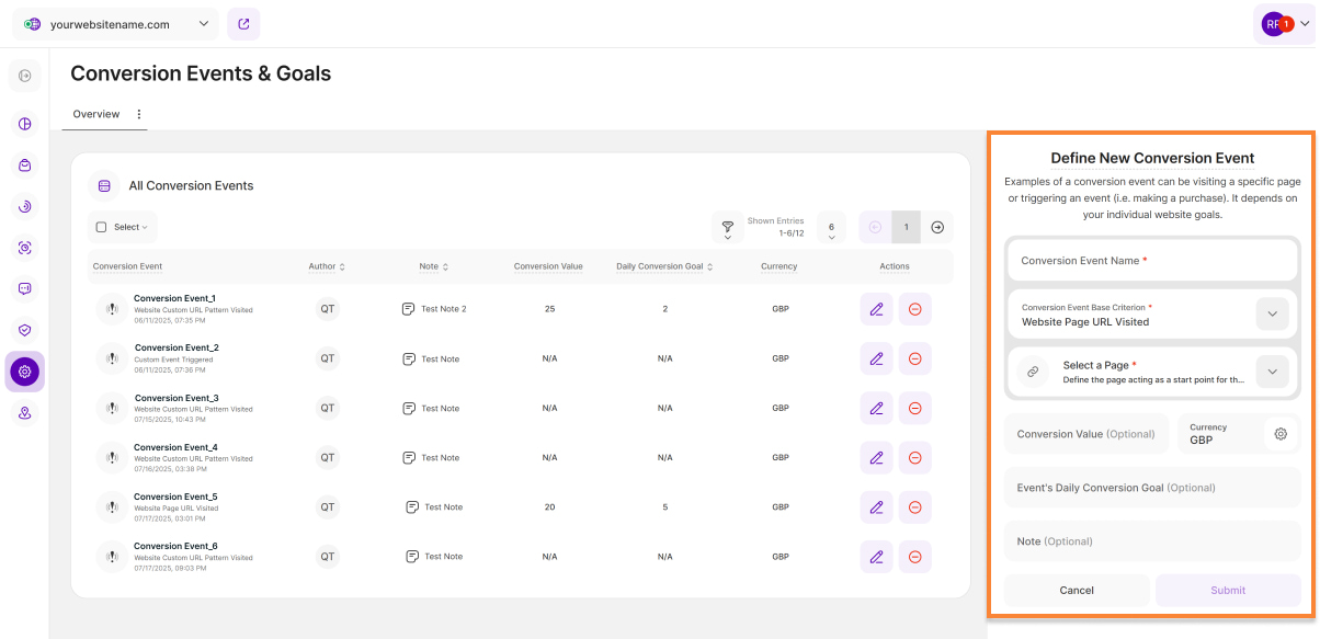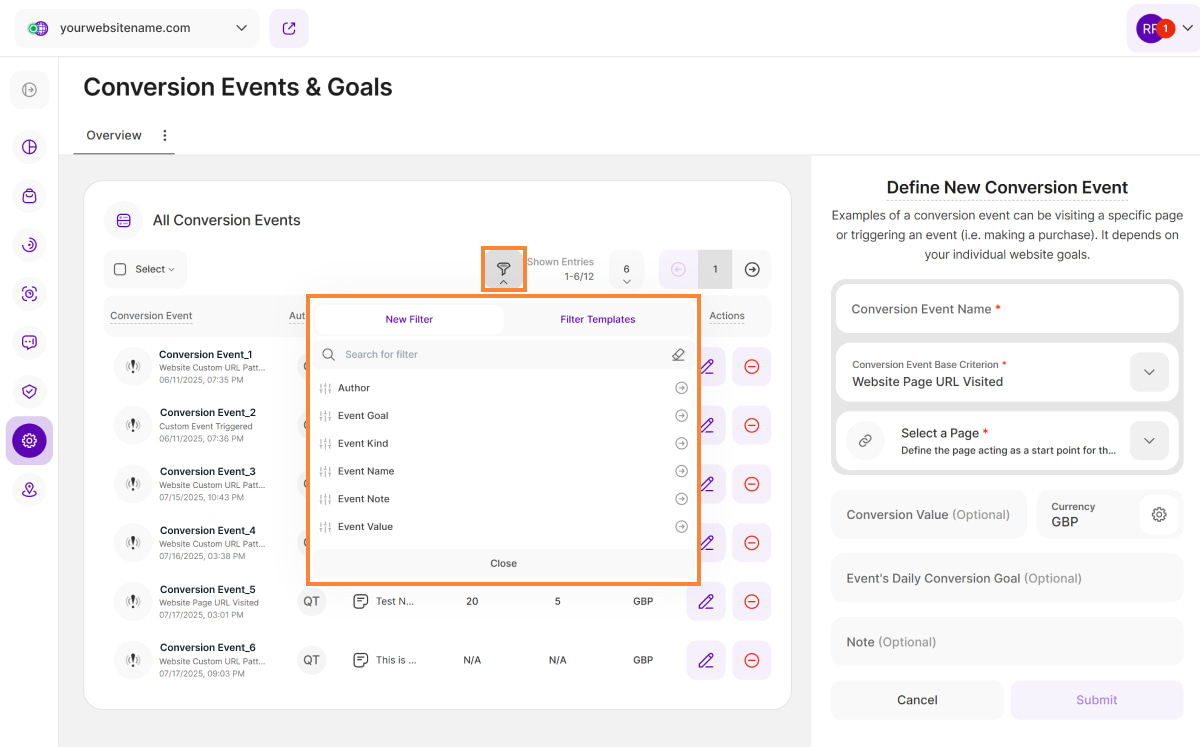 Acest instrument vă permite să grupați pagini de pe site-ul dvs. web care au aceeași structură vizuală, dar diferă prin parametrii dinamici din URL-urile lor (de ex, yourwebsitename.com/thank-you/{order-id} și yourwebsitename.com/thank-you/{user-id}). În acest fel, puteți afișa statisticile pentru acest "grup de pagini" definit de dvs. în formă comprimată pe întreaga platformă.