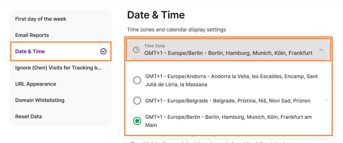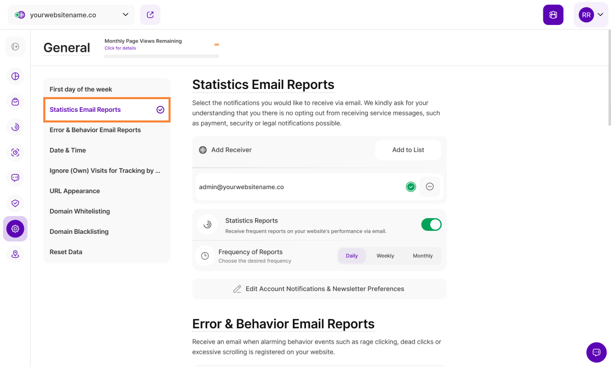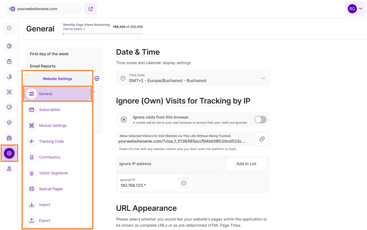 Aici veți găsi toate setările generale importante, cum ar fi fusul orar, rapoartele de e-mail și multe altele, pe care le puteți defini pentru fiecare site web. Puteți actualiza setările site-ului web oricând doriți. Aceste setări sunt disponibile atât pentru proprietarii de site-uri web, cât și pentru colaboratorii acestora.