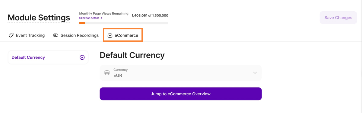 Această secțiune din Setările modului vă permite să setați moneda implicită pentru toate Evenimentele de conversie. Moneda implicită curentă este USD. Pentru a o schimba, pur și simplu faceți clic pe meniul derulant și selectați moneda dorită. Schimbarea monedei conversiilor va afecta, de asemenea, toate monedele afișate în tabel și în modulul principal.