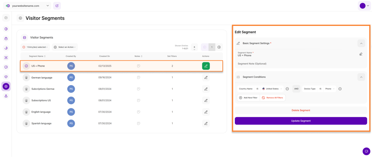 - În tabelul Segmente vizitatori, alegeți segmentul specific pe care doriți să îl editați atingând pictograma creion de sub coloana Acțiuni pentru a intra în modul de editare pentru acest segment.