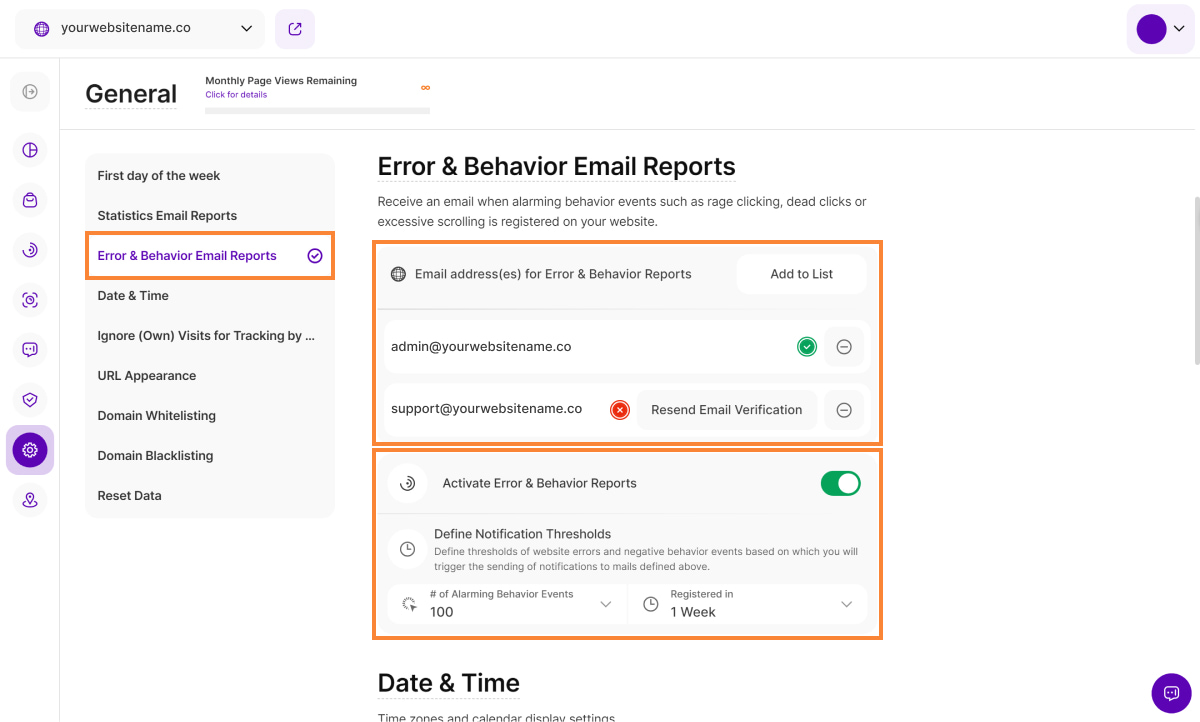 Setează adresele de email către care pot fi trimise rapoarte de alertă pentru erori atunci când evenimente comportamentale ieșite din comun (ABE) sunt detectate pe site-ul dvs. web, cum ar fi clicuri compulsive, clicuri fără efect sau derulare excesivă.