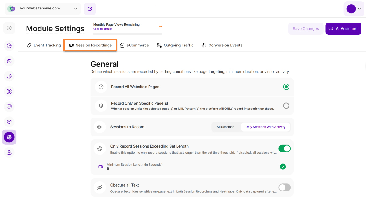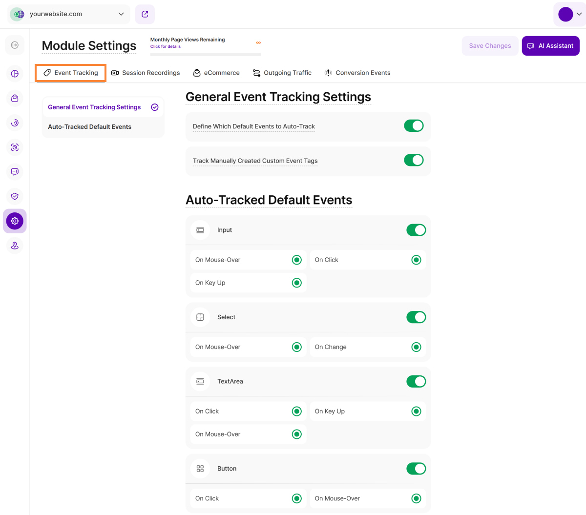 - Dacă aveți mai mult de un site web în contul dvs., rețineți că aceste setări se aplică numai site-ului web selectat în cadrul meniului derulant din colțul din stânga sus al acestei vizualizări. Dacă doriți să aplicați o anumită setare pentru toate site-urile web adăugate în contul dumneavoastră, trebuie să repetați setarea pentru fiecare site web.