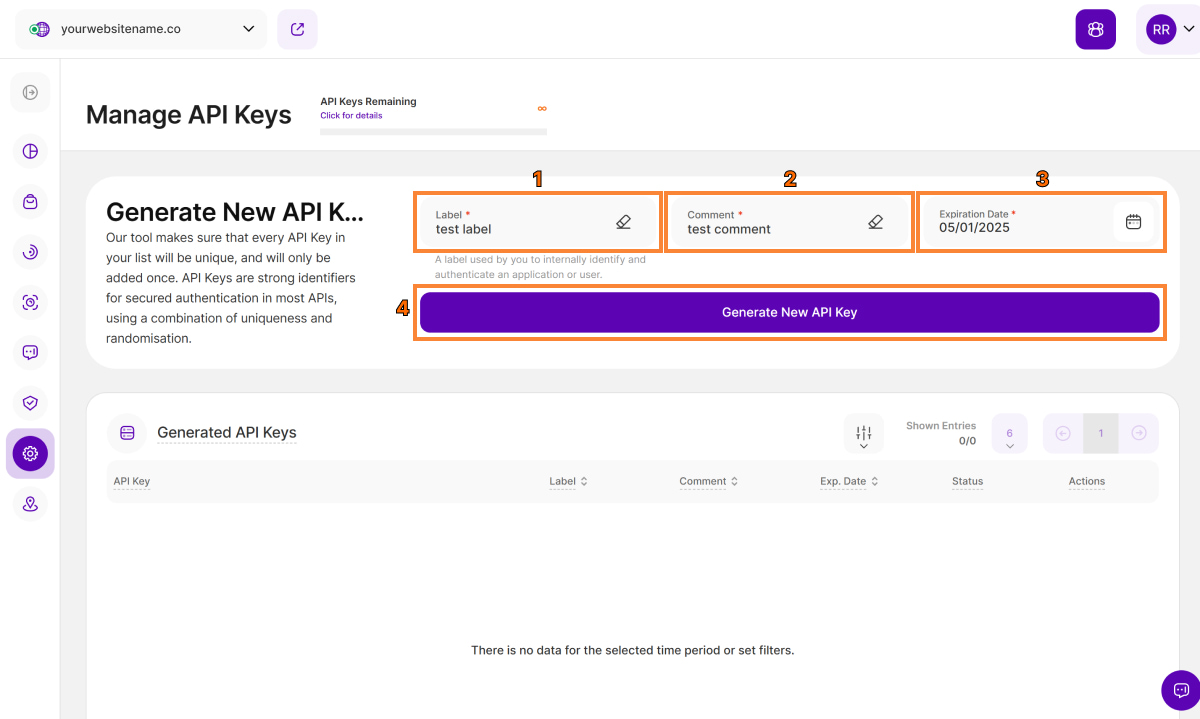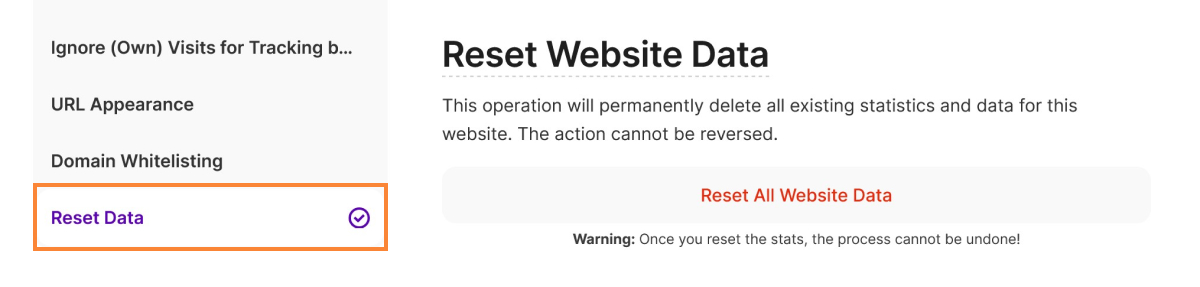 Această opțiune permite proprietarilor de site-uri web să șteargă permanent toate datele de urmărire asociate site-ului în cadrul aplicației noastre. Acțiunea, care poate fi efectuată numai de către proprietarul site-ului web, va șterge toate statisticile din contul dvs. Preferințele dvs. vor fi păstrate la fel ca înainte. Va trebui să confirmați această acțiune prin introducerea parolei dumneavoastră.