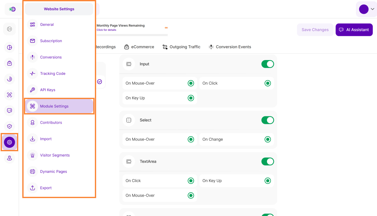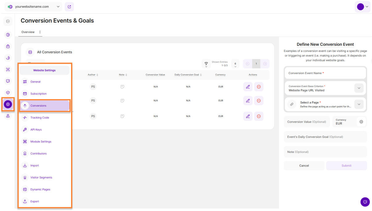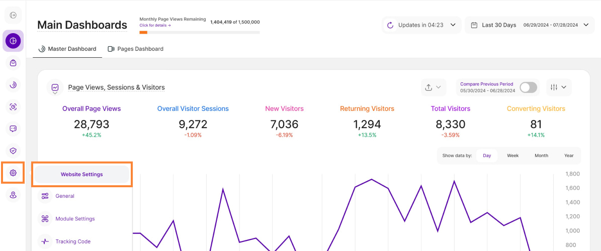 În Setări site web, puteți gestiona componente specifice ale site-ului dvs. web, cum ar fi setările generale, abonamentul, segmentele de vizitatori, exportul și multe altele. Dacă aveți mai multe site-uri web de gestionat, puteți comuta între ele cu ajutorul meniului derulant din colțul din stânga sus.