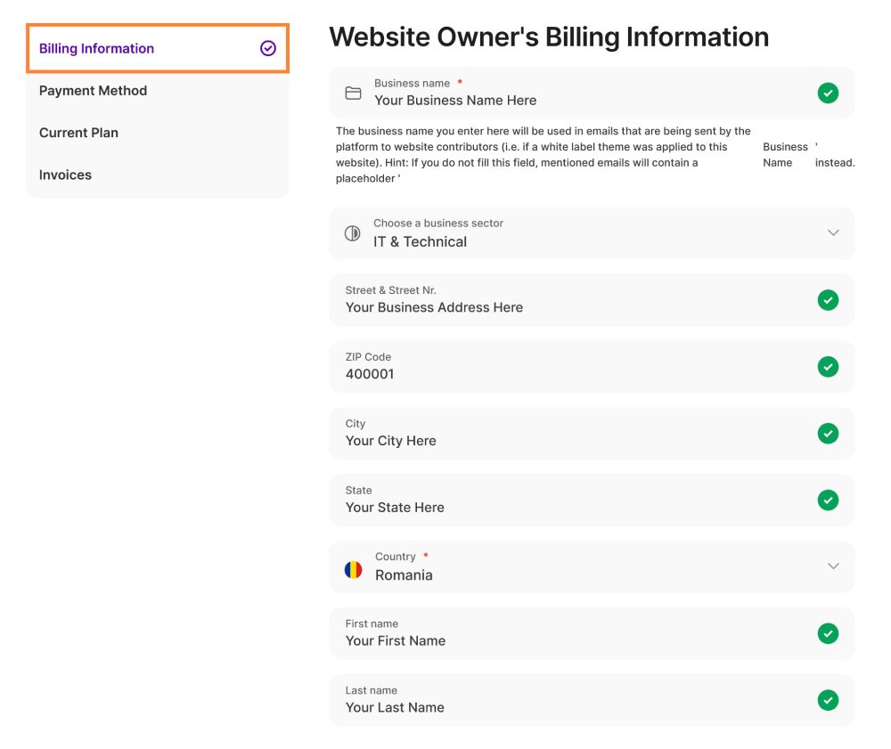 Informațiile pe care le adăugați vor fi utilizate și afișate în extrasele de cont generate automat pentru acest site web.