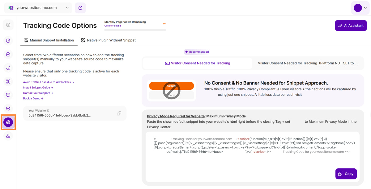 - Localizați codul de urmărire pentru site-ul dvs. web și faceți clic pe Copiați fragmentul pe clipboard pentru a copia codul.