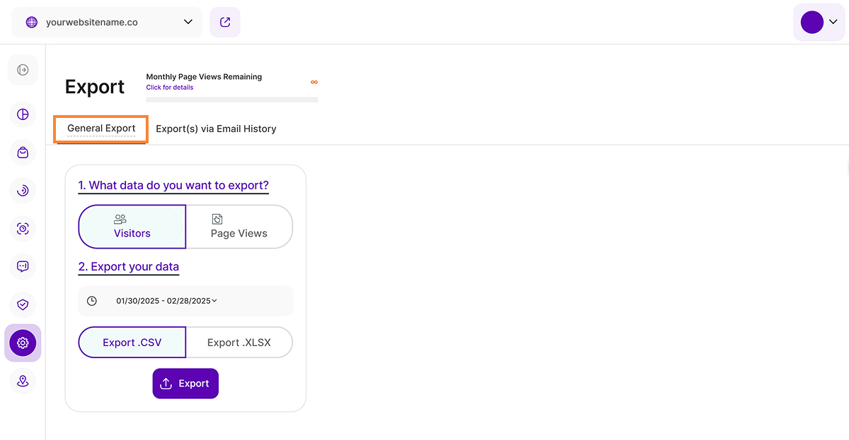 Spuneți adio limitărilor de date! Funcția noastră reînnoită de export vă permite să exportați fără efort chiar și cele mai extinse seturi de date pentru site-ul dvs. inclusiv nume de companii, campanii UTM și multe altele. Dobândiți o înțelegere mai profundă și deblocați informații utile cu ușurință.&